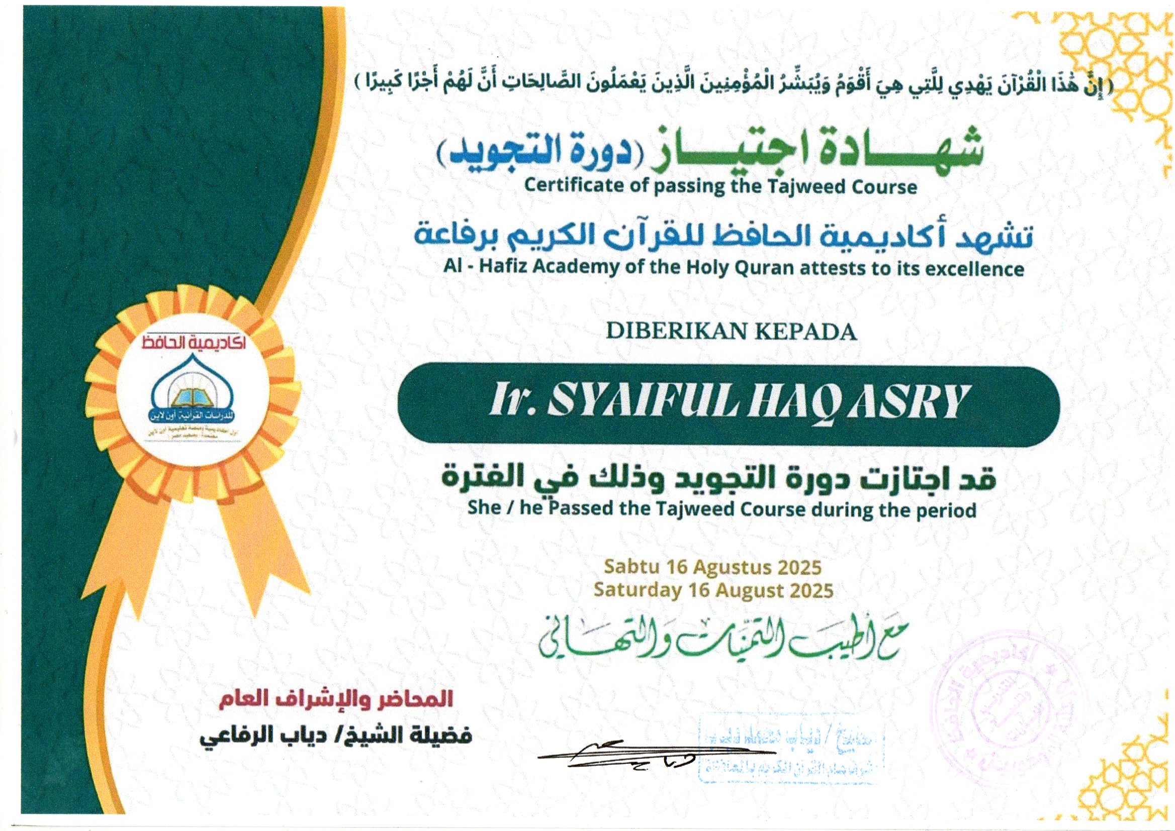 Certificate of passing the Tajweed Course Al-Hafiz Academy of the Holy Quran attests to its excellence